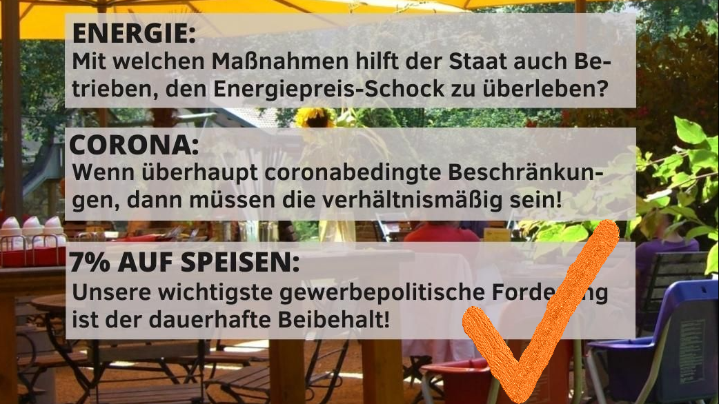 Die Absenkung der Umsatzsteuer für Speisen in der Gastronomie auf 7 Prozent wird verlängert, um die Gastronomiebranche zu entlasten und die Inflation nicht weiter zu
