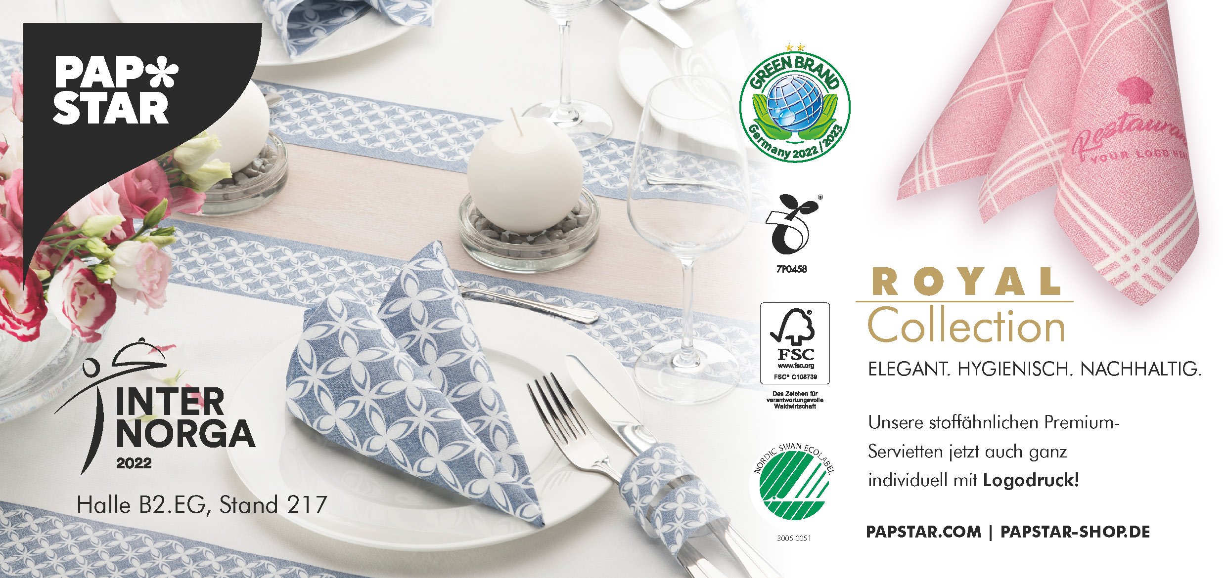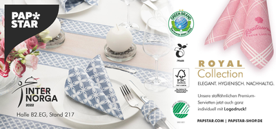 Elegant, hygienisch und nachhaltig - die stoffähnlichen Servietten des Premium-Labels ROYAL Collection sind in einer großen Farbvielfalt erhältlich, von Unifarben über Ton-in-Ton-Motive bis hin zu modernen Blumendesigns oder Karo-Mustern und lassen sich optimal mit weiteren Dekorations-Artikeln aus dem PAPSTAR-Sortiment kombinieren.